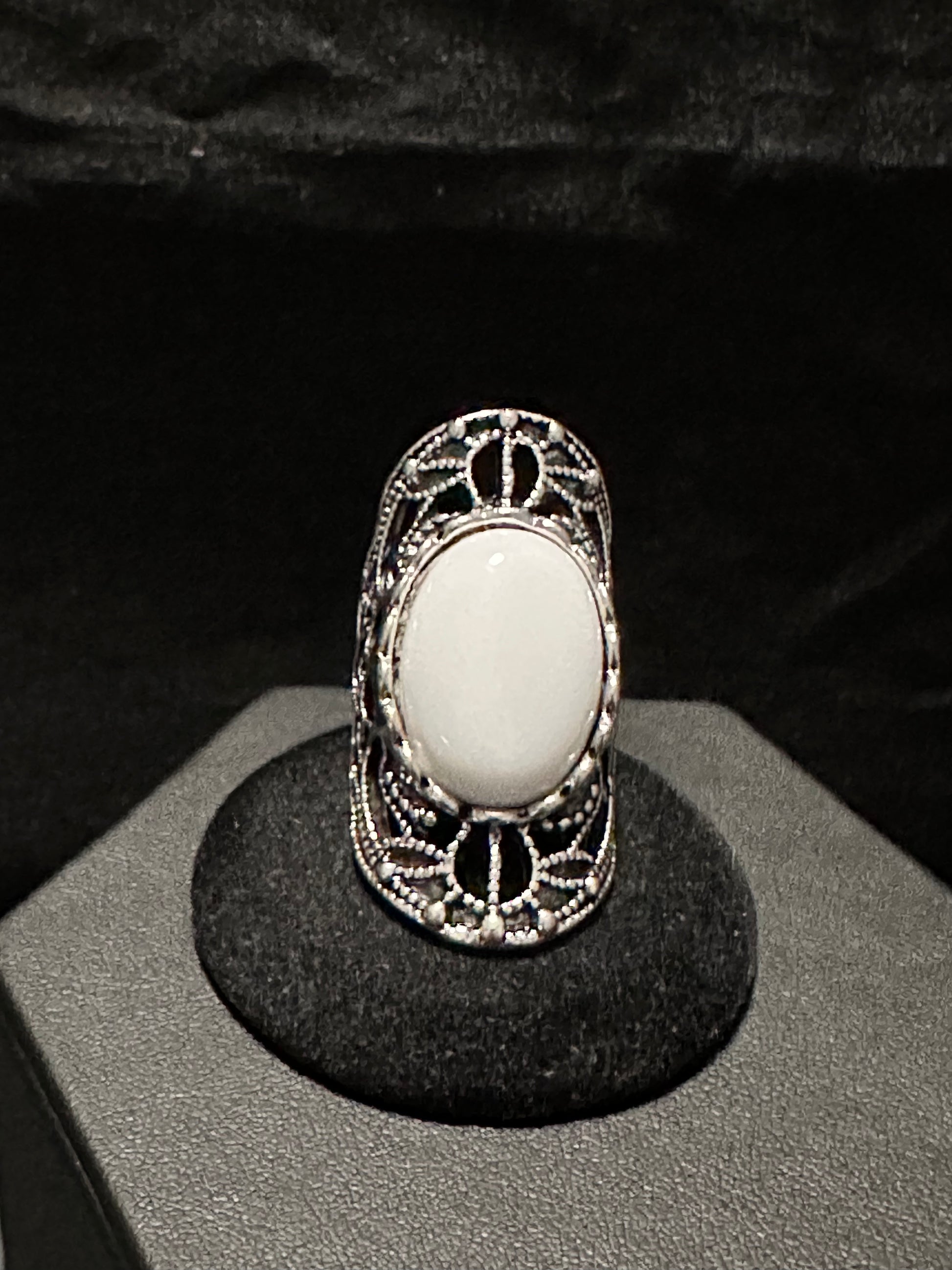 An oversized white Bead is pressed into the center of an ornate silver frame studded with whimsical filigree for a dramatic look. Features a stretchy band for a flexible fit.