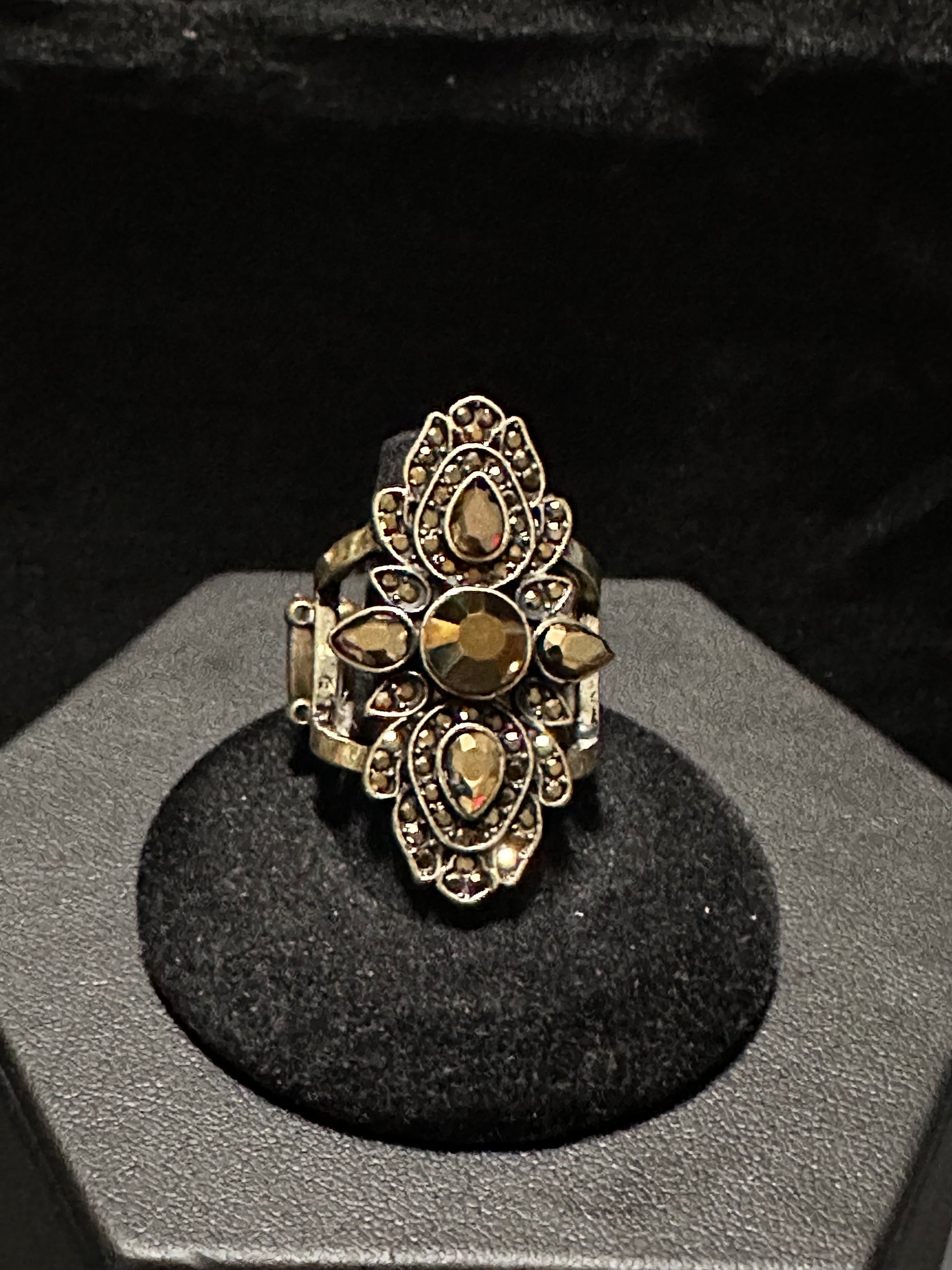 Featuring round and teardrop cuts, glittery aurum rhinestones scatter across petal-like brass frames, coalescing into a regal centerpiece atop the finger. Features a stretchy band for a flexible fit.