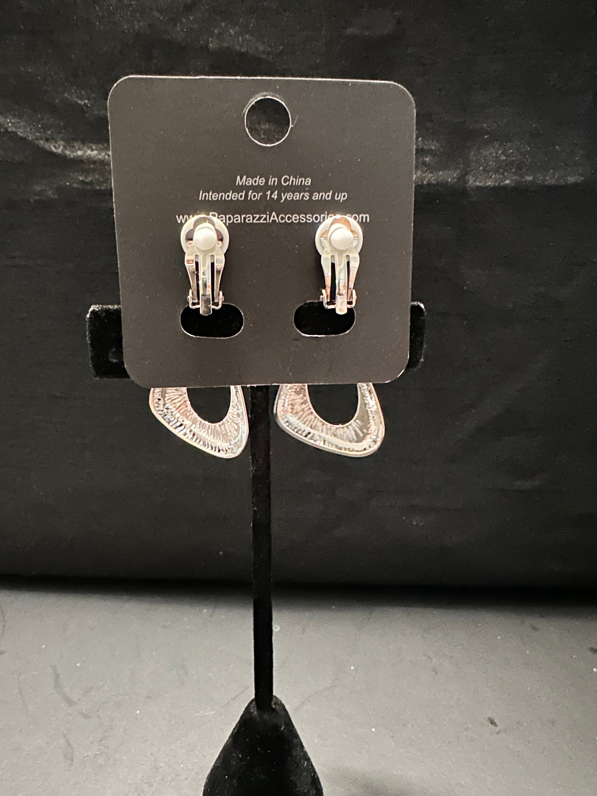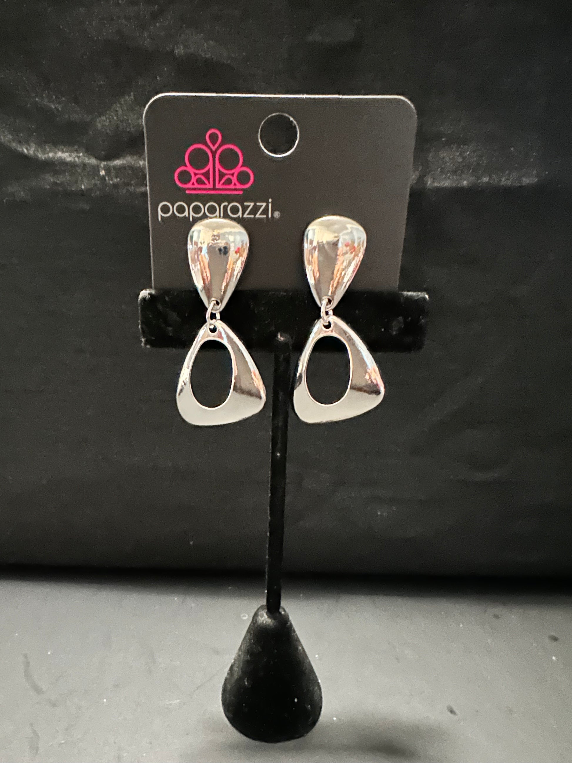 An airy asymmetrical silver frame dangles from the bottom of a triangular frame, creating an abstract lure. Earring attaches to a standard clip-on fitting