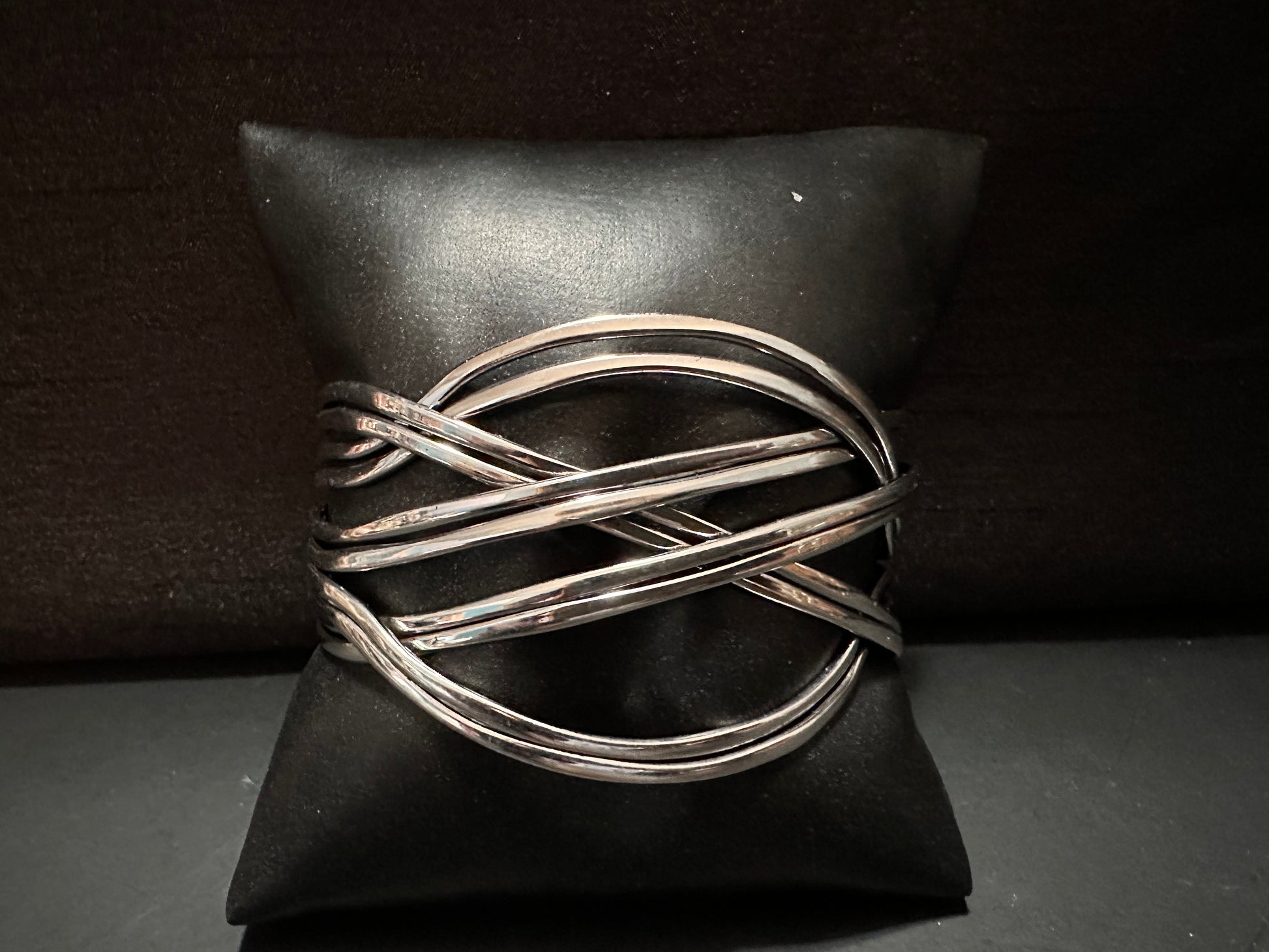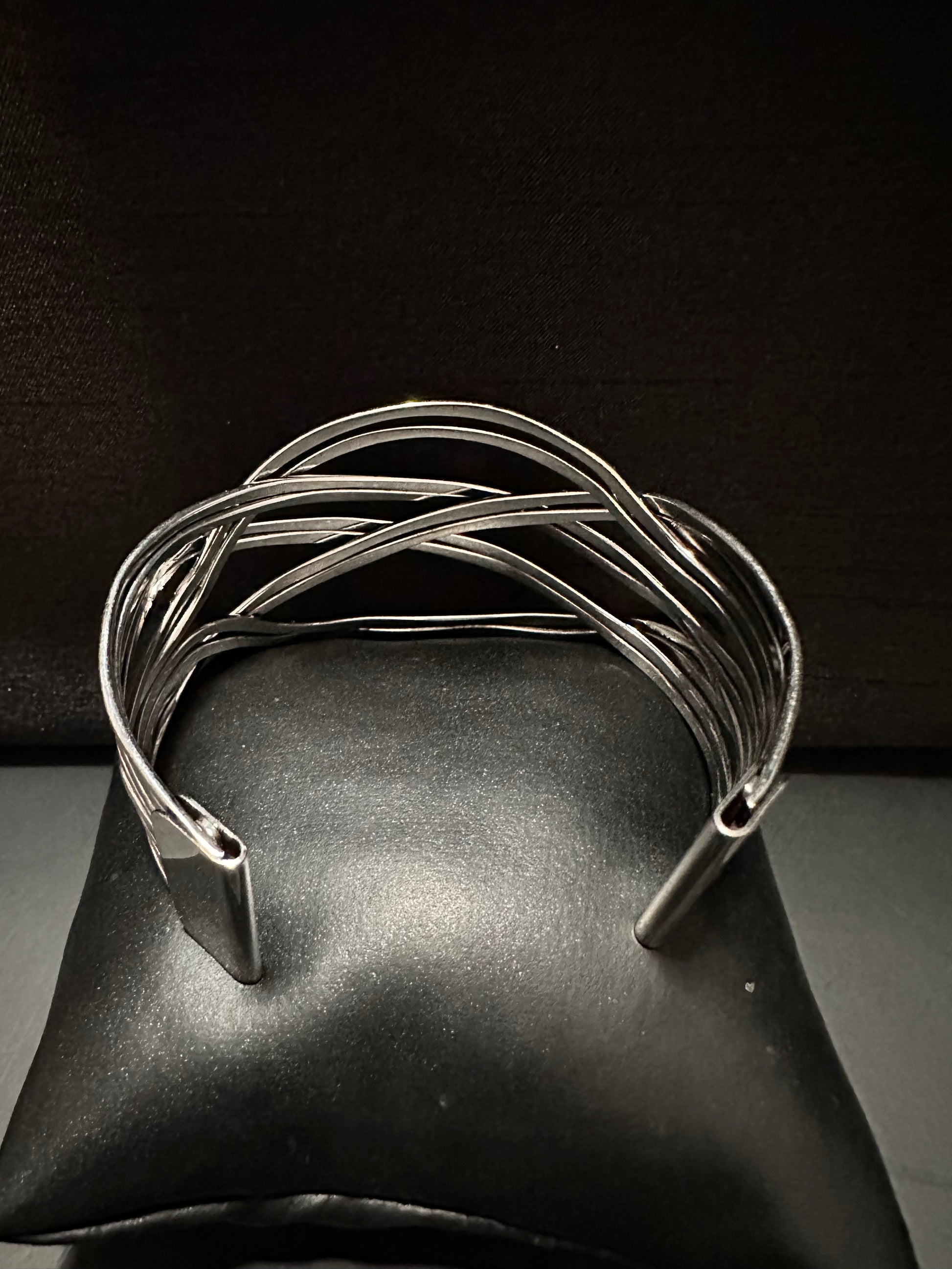 Brushed in Silver, hammered out pieces of flat silver bars decoratively weave into a curved cuff around the wrist for an intense industrial finish.