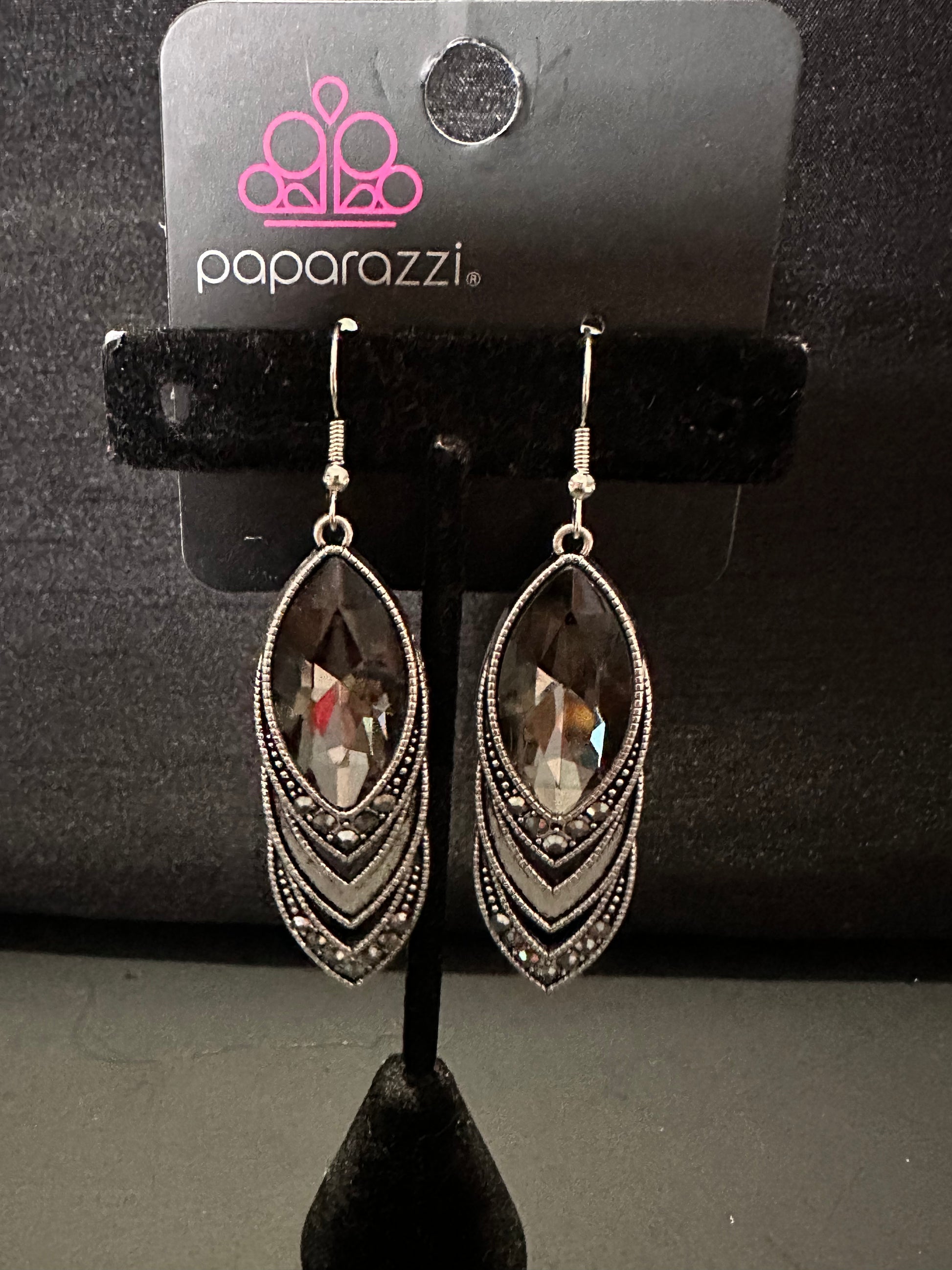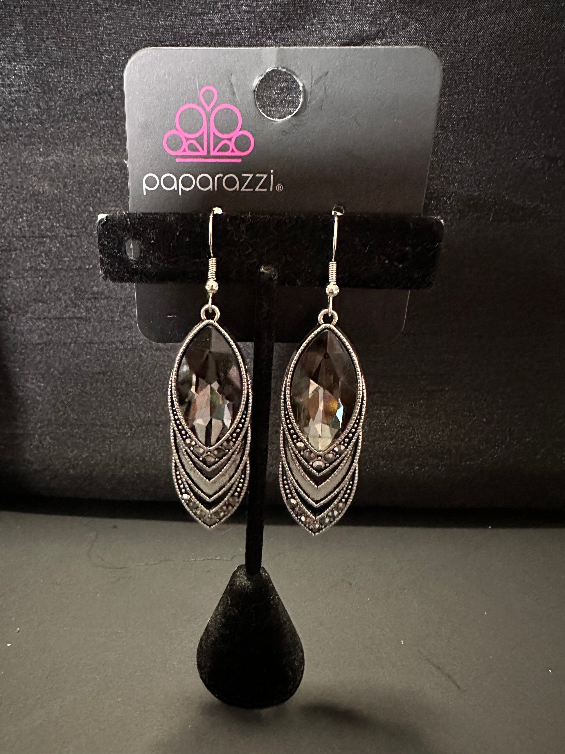 A dramatic smoky marquise-cut rhinestone gives way to alternating silver and hematite encrusted silver frames, coalescing into a glamorous statement piece. Earring attaches to a standard fishhook fitting