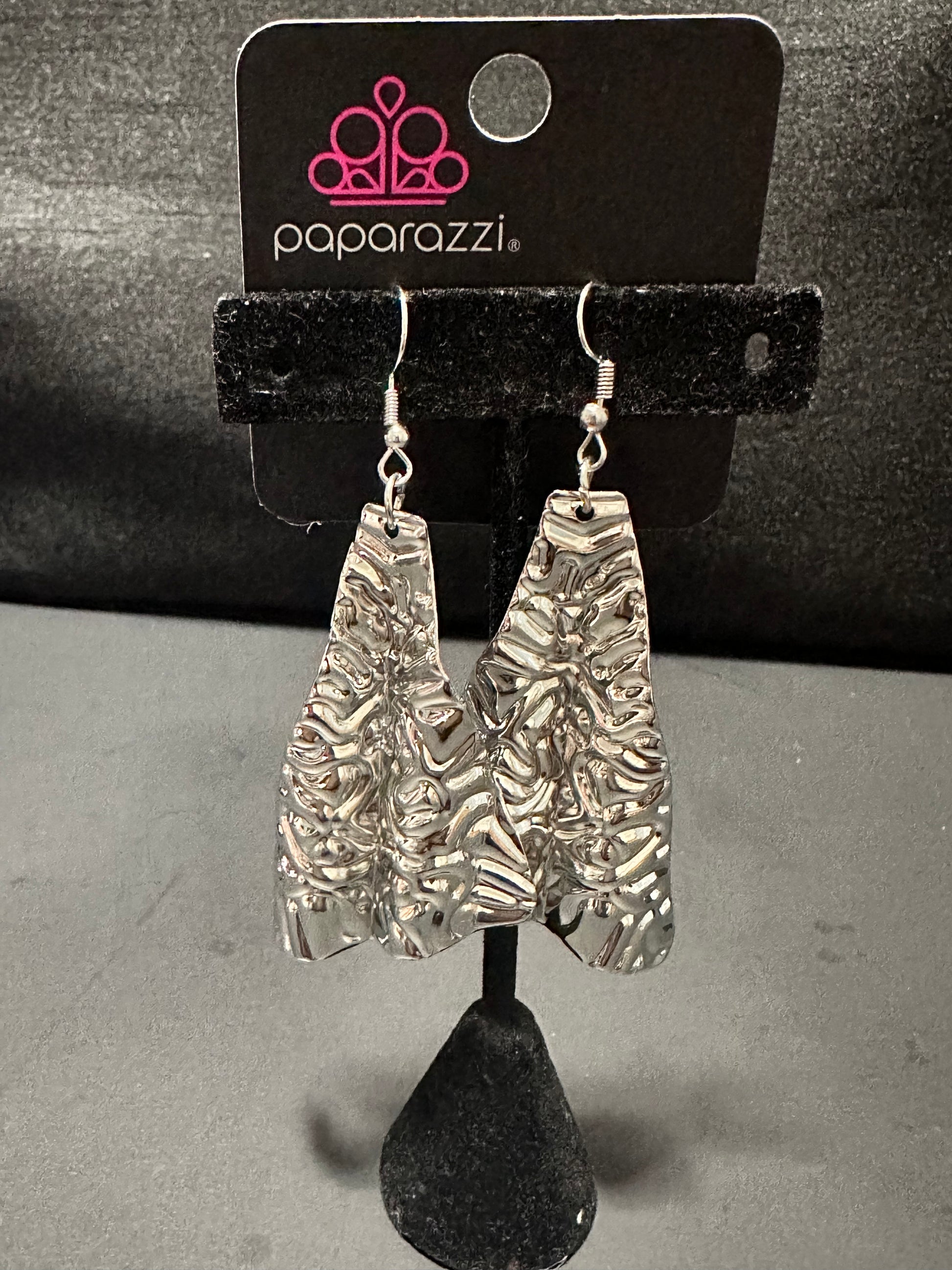 Embossed in wavy details, a flared silver frame creases into a rippling lure for an edgy loo. Earring attaches to a standard fishhook fitting.