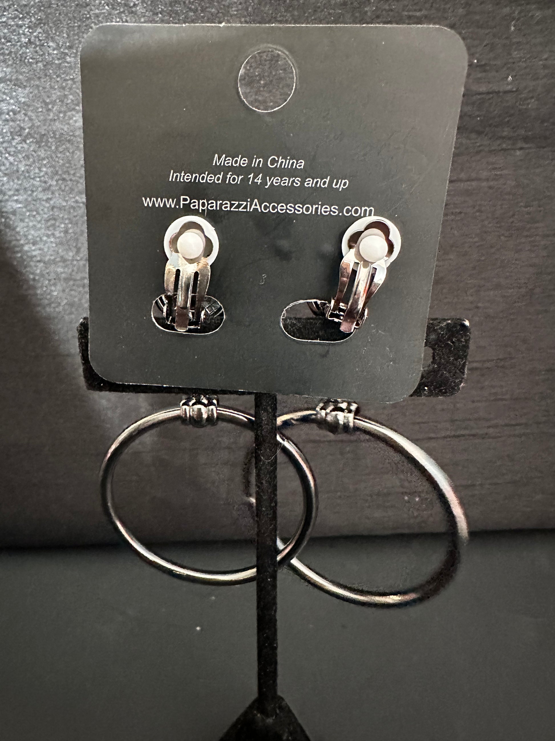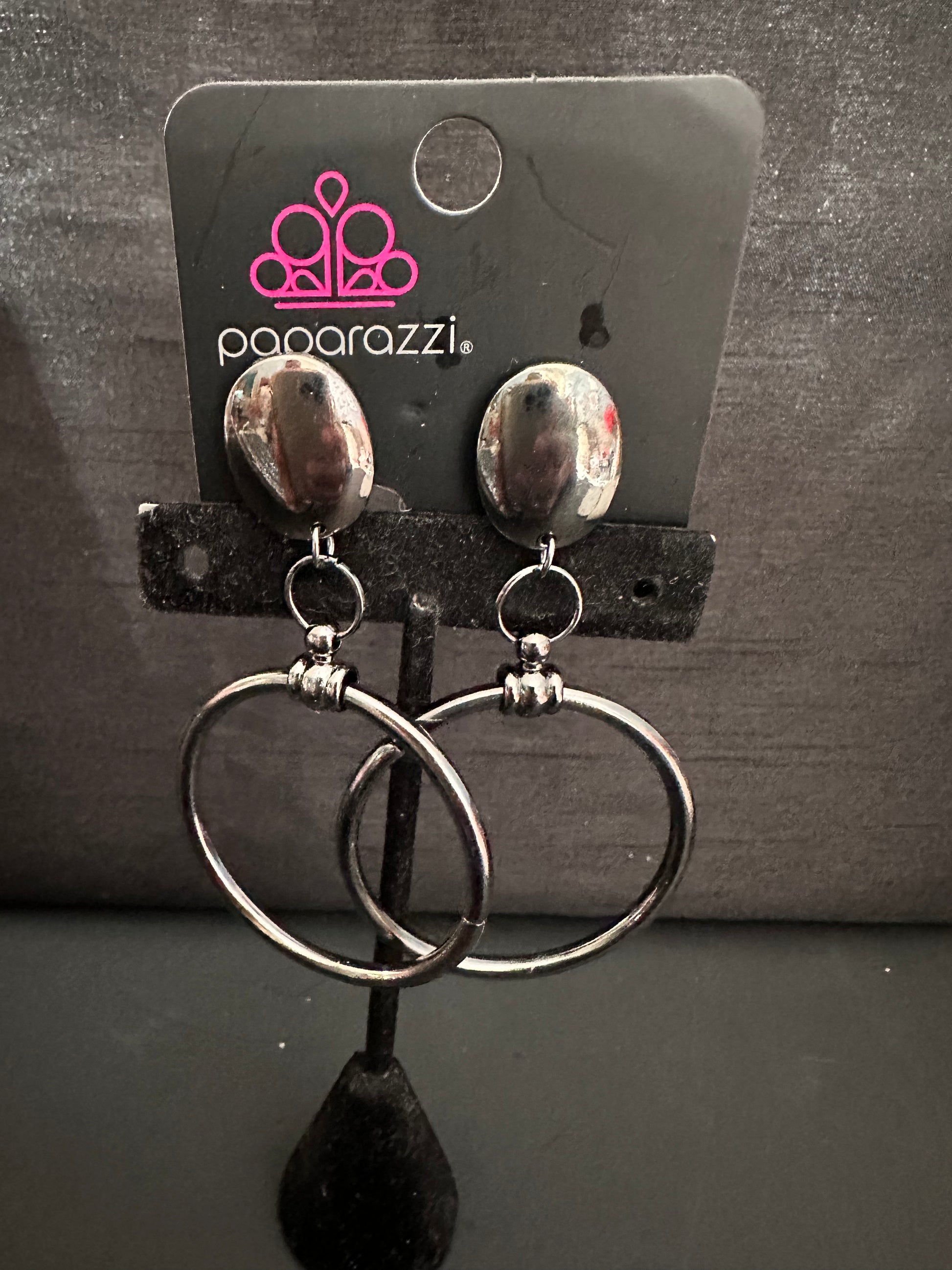 A thick gunmetal hoop is threaded through the center of a dainty gunmetal fitting that links to an oval gunmetal frame, creating a classic look. Earring attaches to a standard clip on fitting