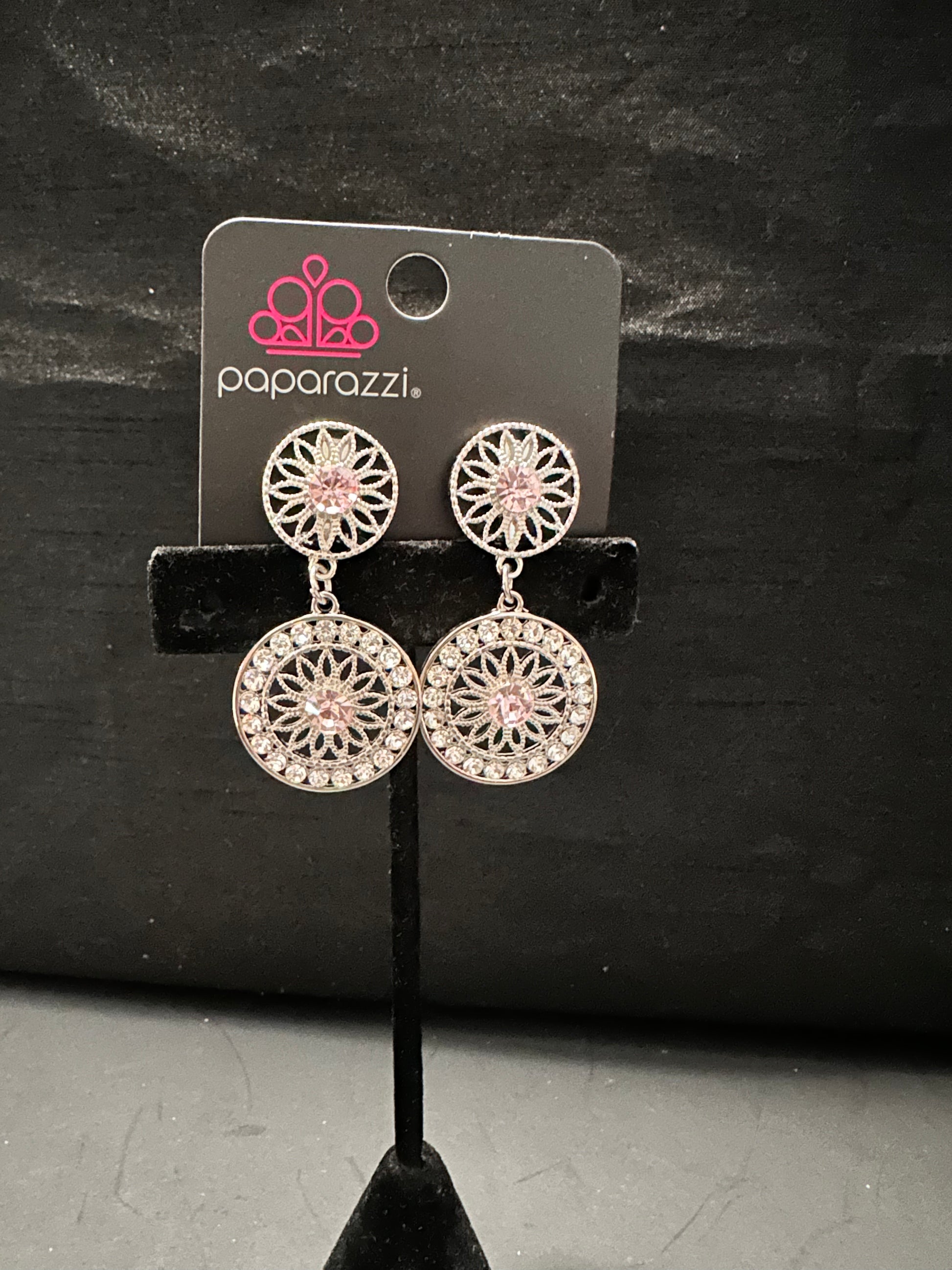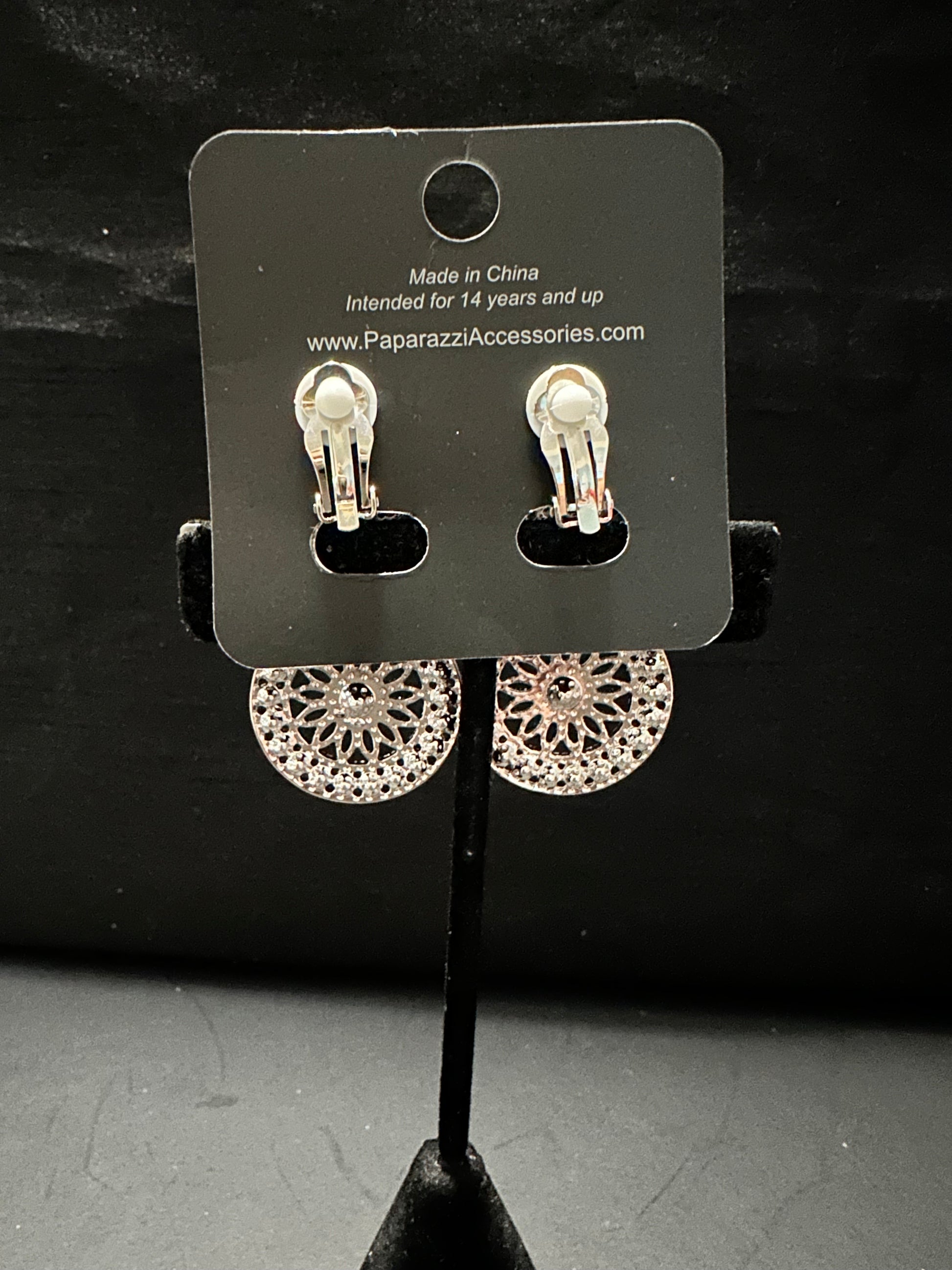 Dotted with glittery pink rhinestone centers, shimmery silver floral frames link into a whhimsical lure. The lower frame is bordered in glassy white rhinestones for a timeless finish earrin attaches to a standard clip on fitting