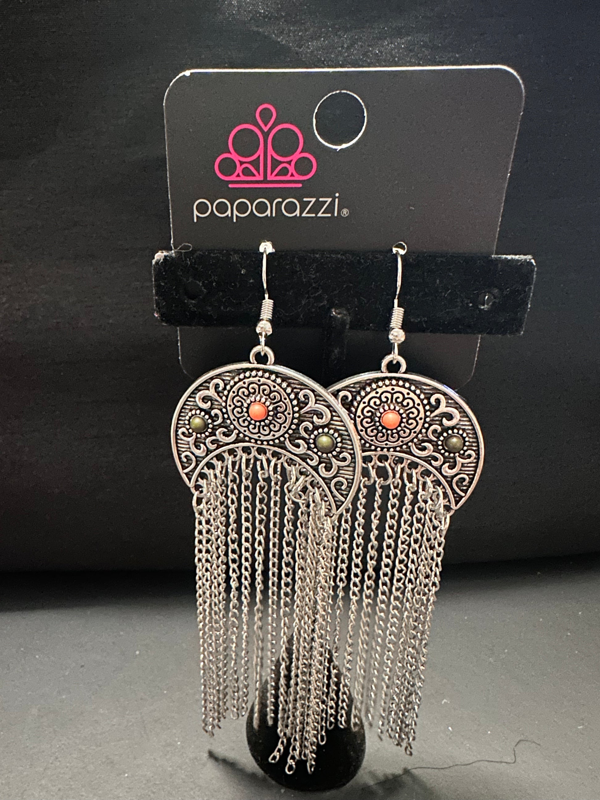 Dotted with dainty coral and green beads, an ornate silver half-moon frame gives way to sparkling silver chain fringe for a wanderlust vibe. Earring attaches to a standard fishhook fitting