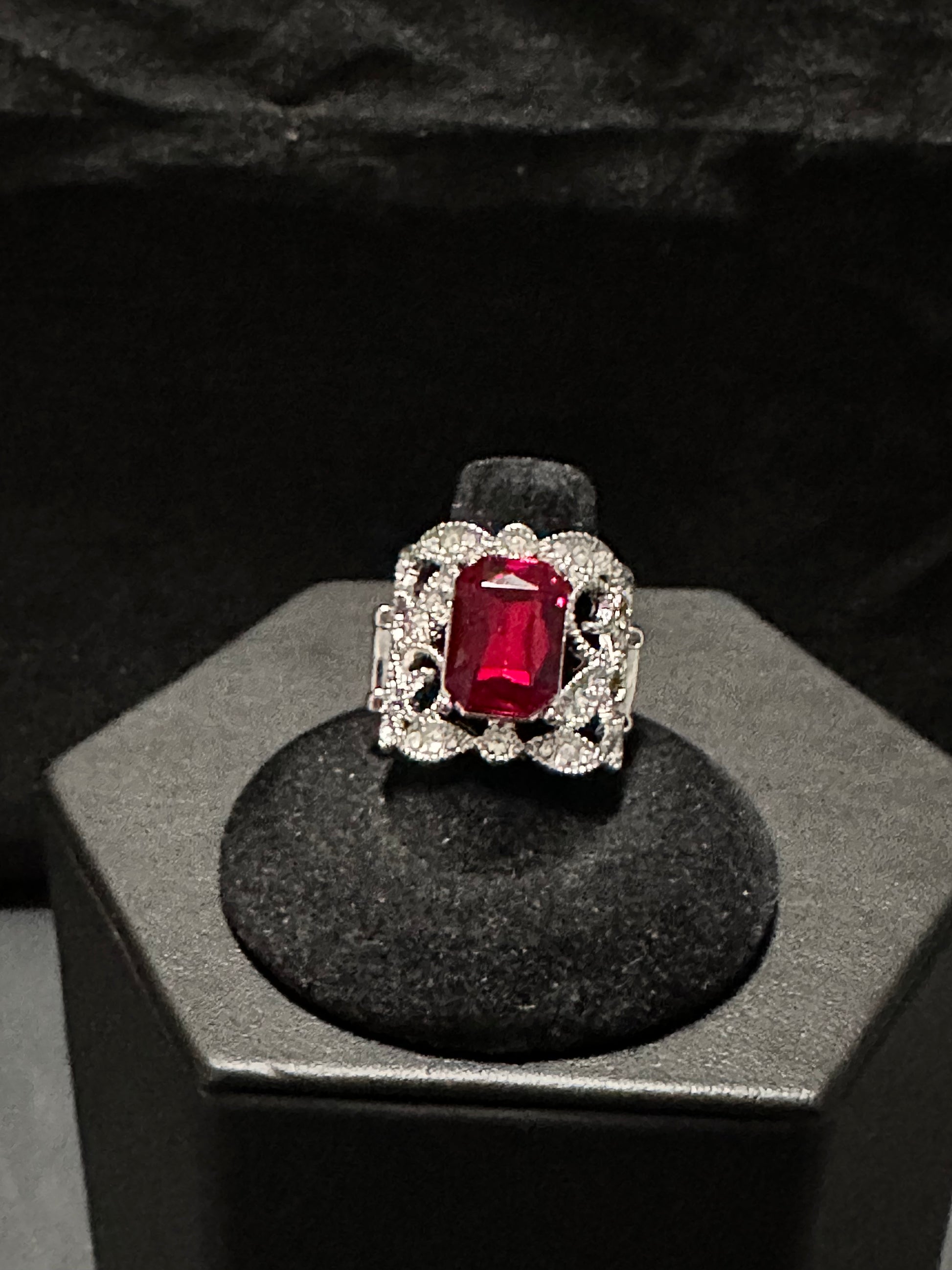 A fiery red emerald cut rhinestone sits atop a backdrop of shimmery silver vine-like filigree that has been delictely dotted in glassy white rhinestones, creating a regal centerpiece. Features an adjustable clasp closure.