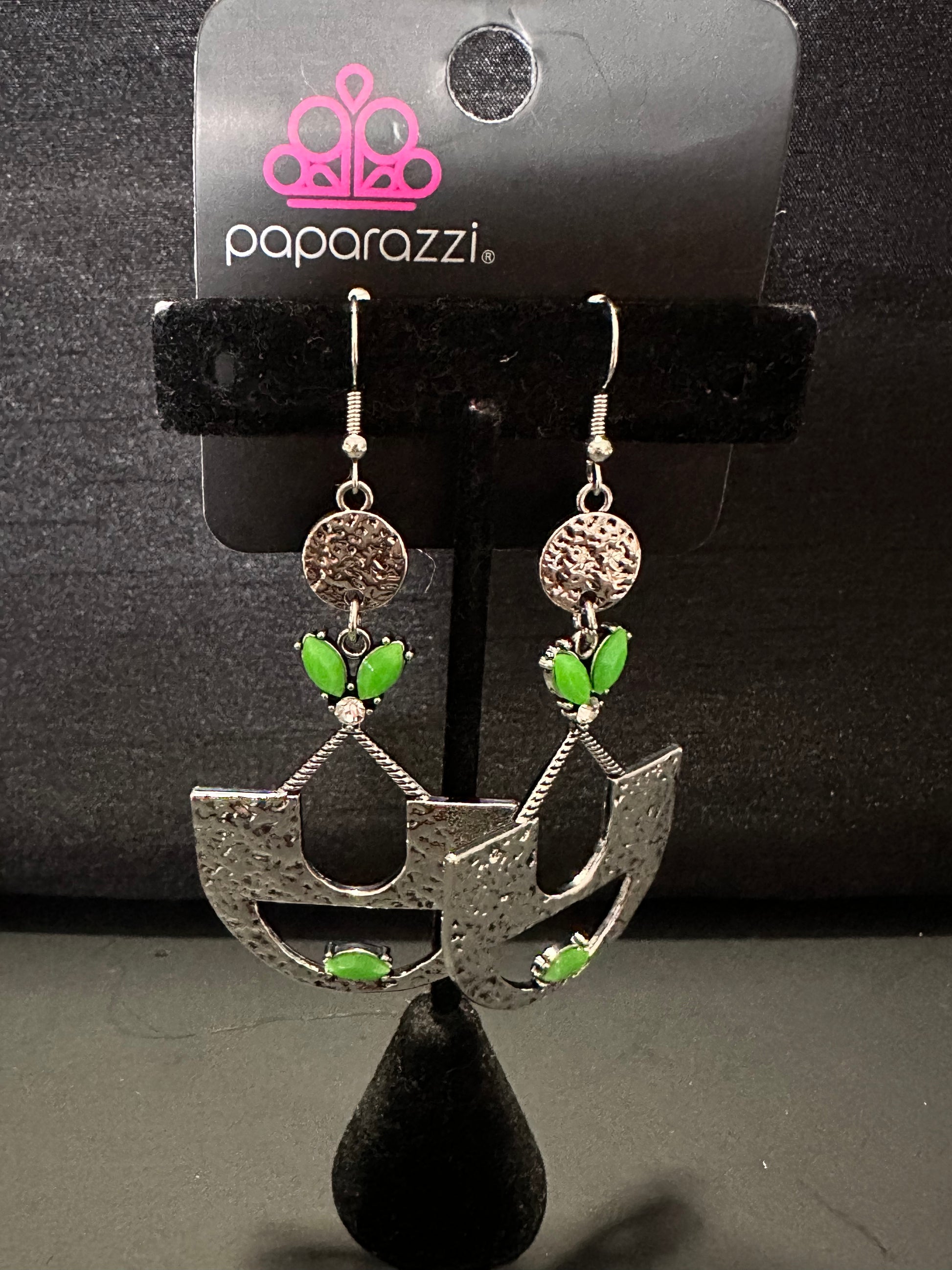 Featuring a glittery white rhinestone and faceted neion green beading, an abstract crescent frame attaches to a hammered silver disc, creating a colorfully rustic lure. Earrings attaches to a standard fishook fitting.