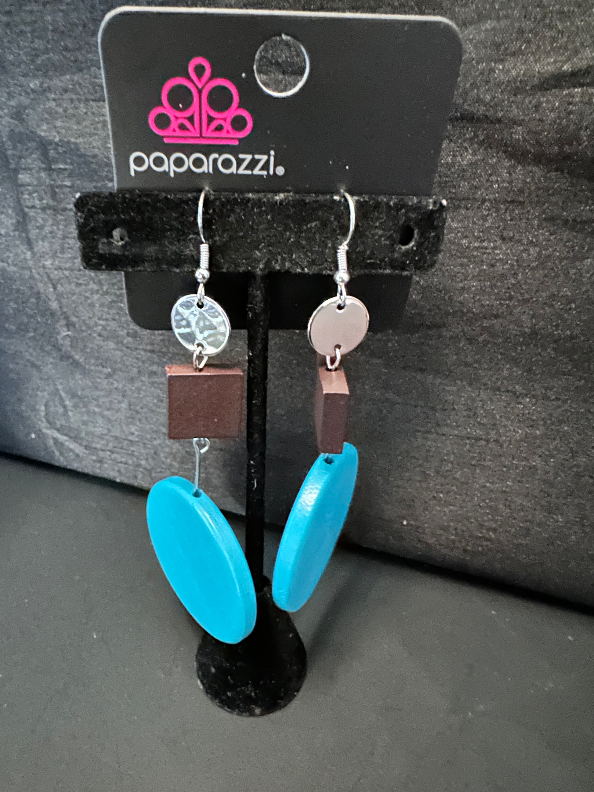 A shiny silver disc, brown wooden square, and oversizied blue wooden circle delicately link into a colorfully retro lure for a trendsetting finish.