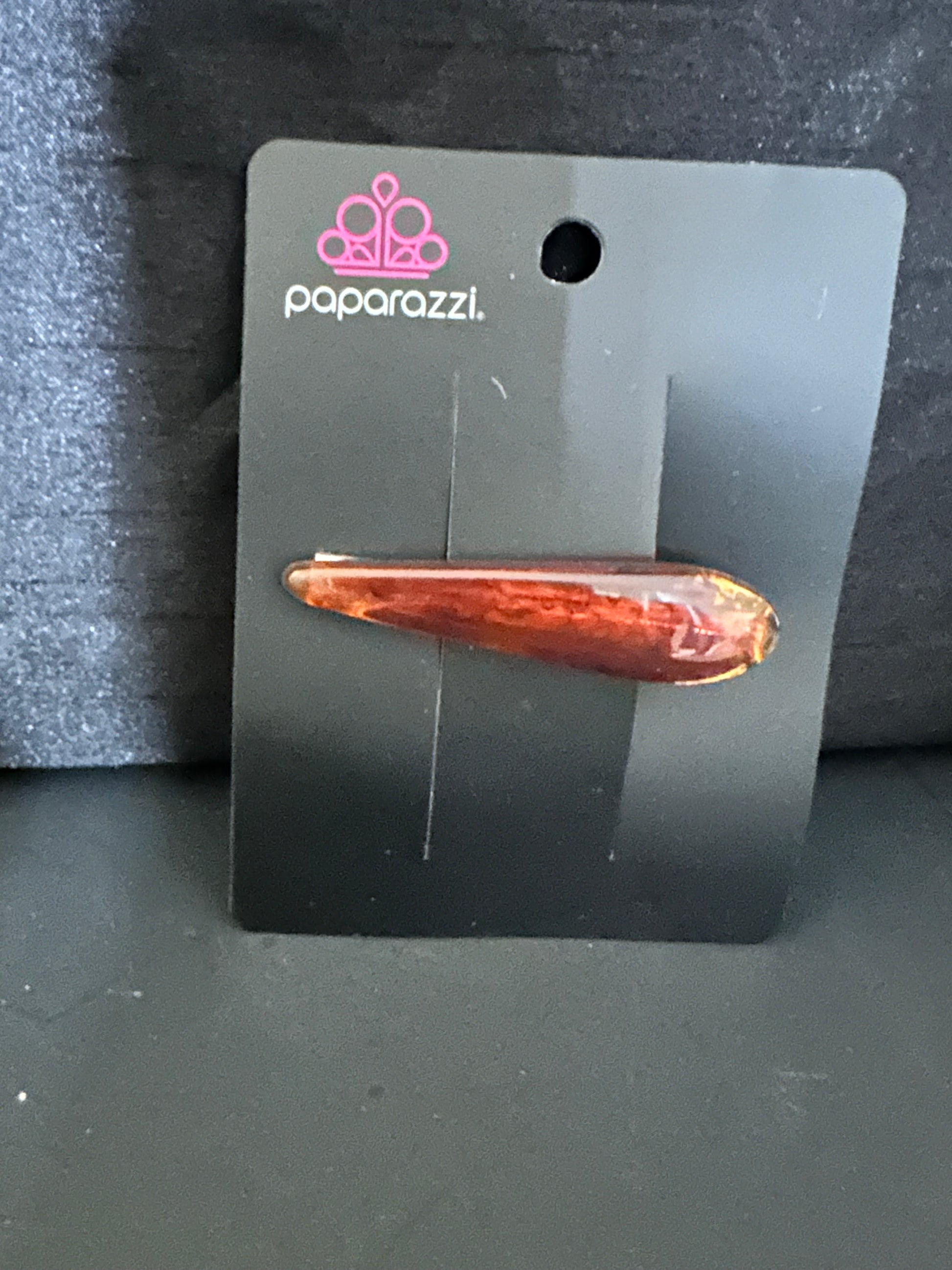Featuring a smoky finish, a glassy brown acrylic frame adheres to a basic silver clip for a retro inspired look. Features a standard hair clip on the back.