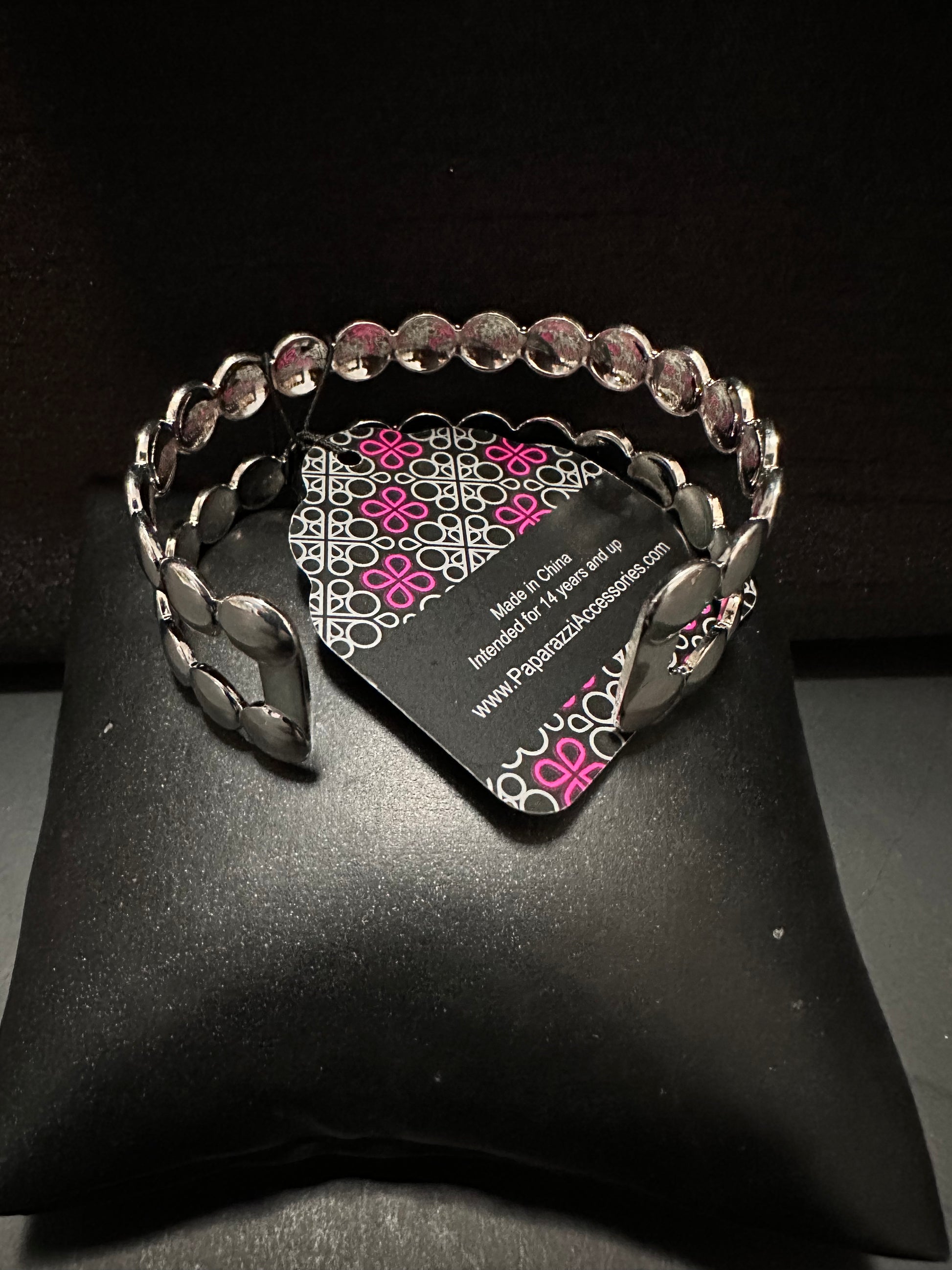 Brushed in a shiny finish, rows of flattened silver studs coalesce into a shimmery cuff around the wrist.