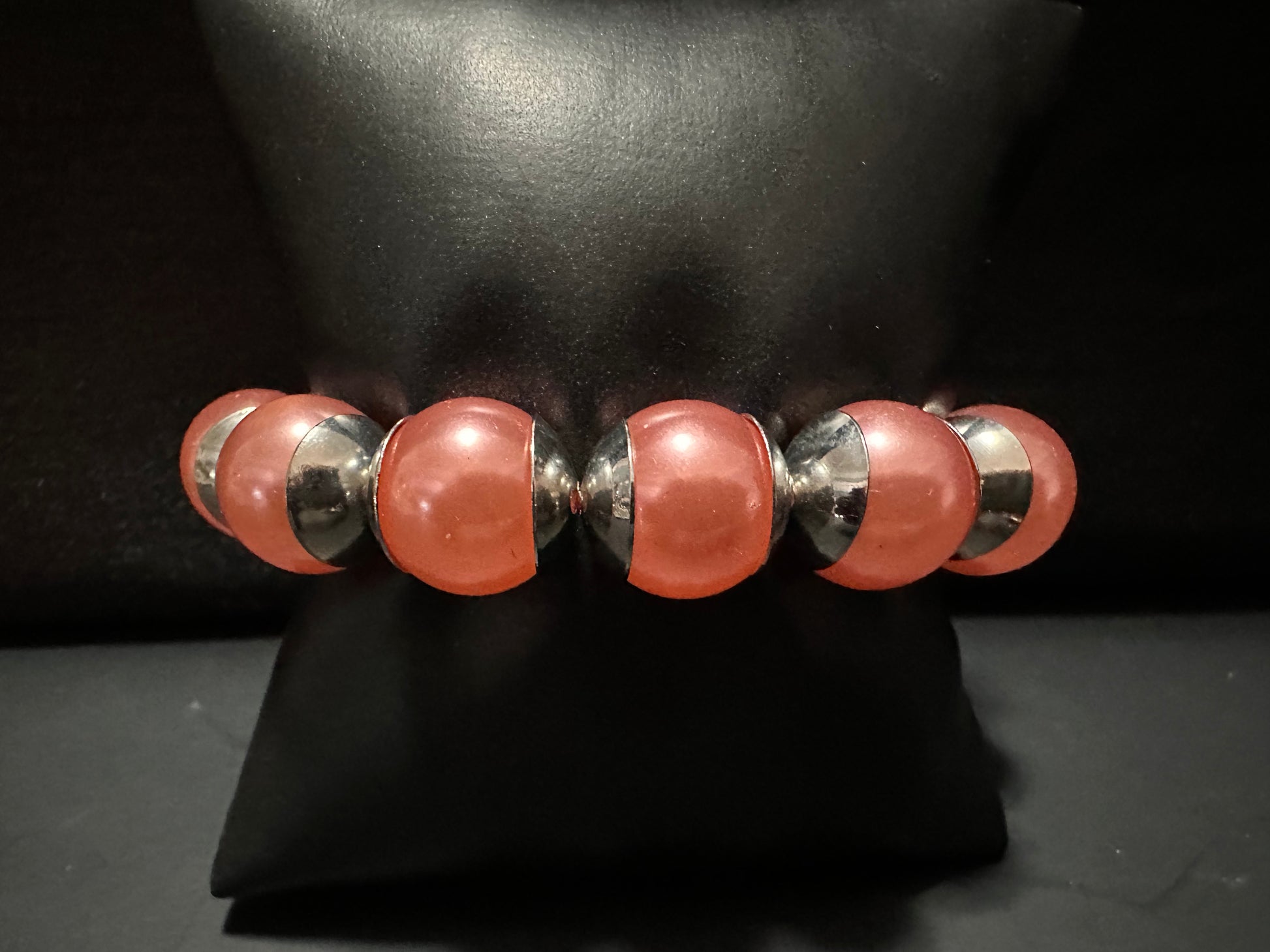 Capped in silver fittings, oversized orange pearls are threaded along a stretchy band around the wrist for a refined look.
