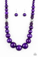 Infused with dramatic silver beads an array of vivacious purple wooden beads drape across the chest for a summery look. Includes a pair of matching earrings.