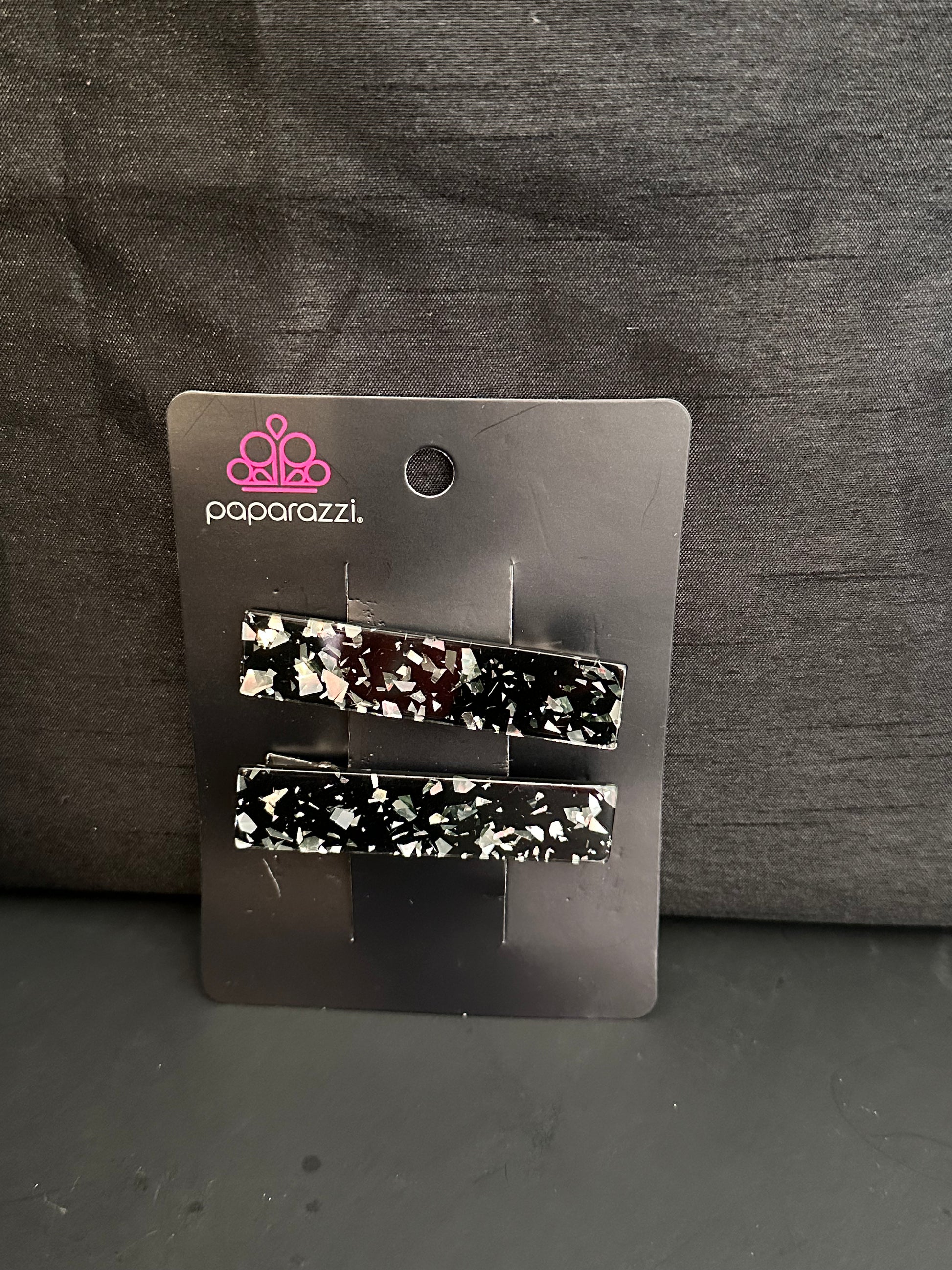 Featuring silvery iridescent flecks, a pair of black rectangular hair clips pull back the hair for a retro look. Features a standard hair clip on the back.