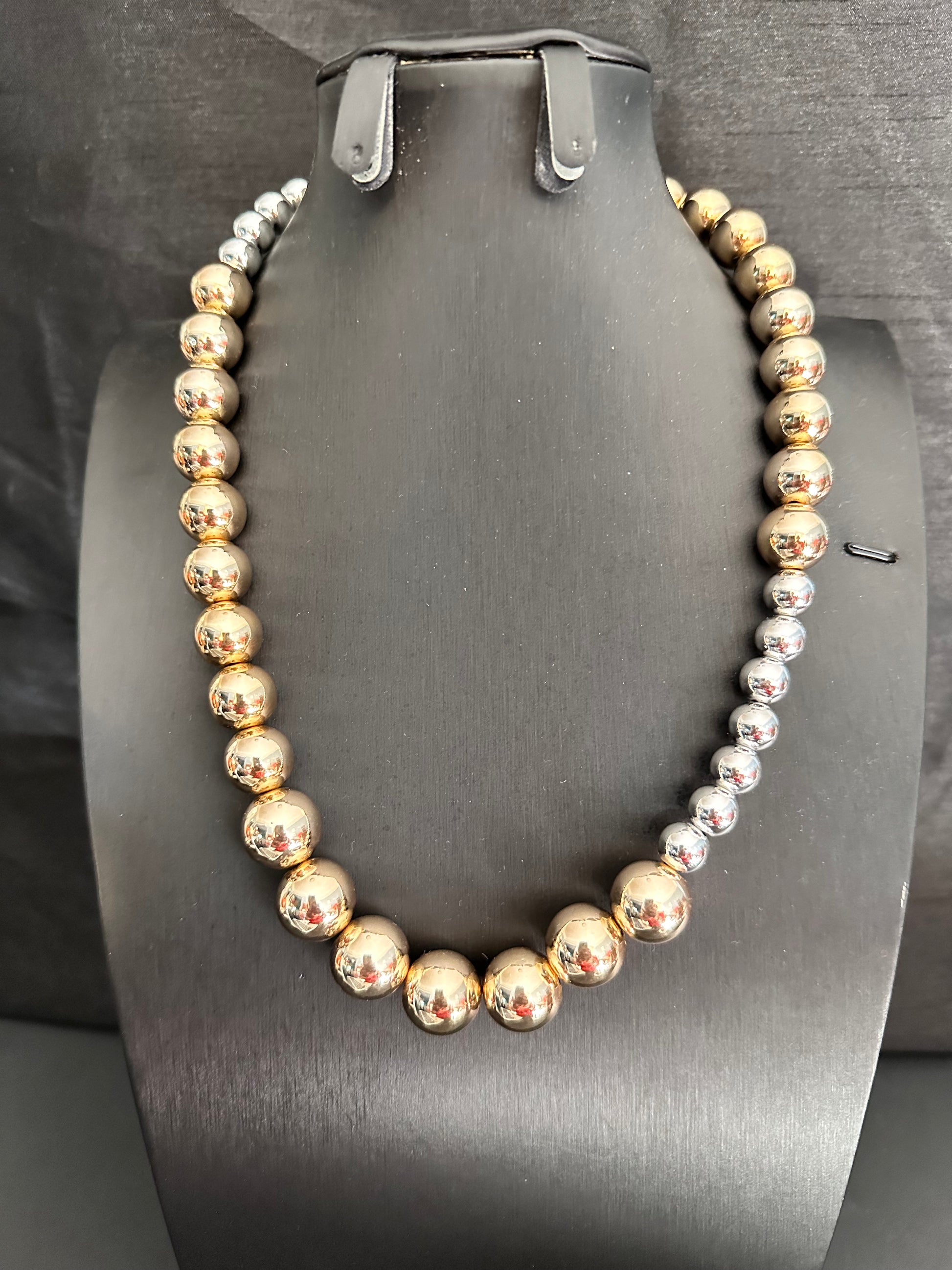 Varing in size, glistening gold and sliver beads drape below the collar in dramatically asymetrical fashion. Features an adjustable clasp closure. Sold as one individual necklace. Includes one pair of matching earrings.