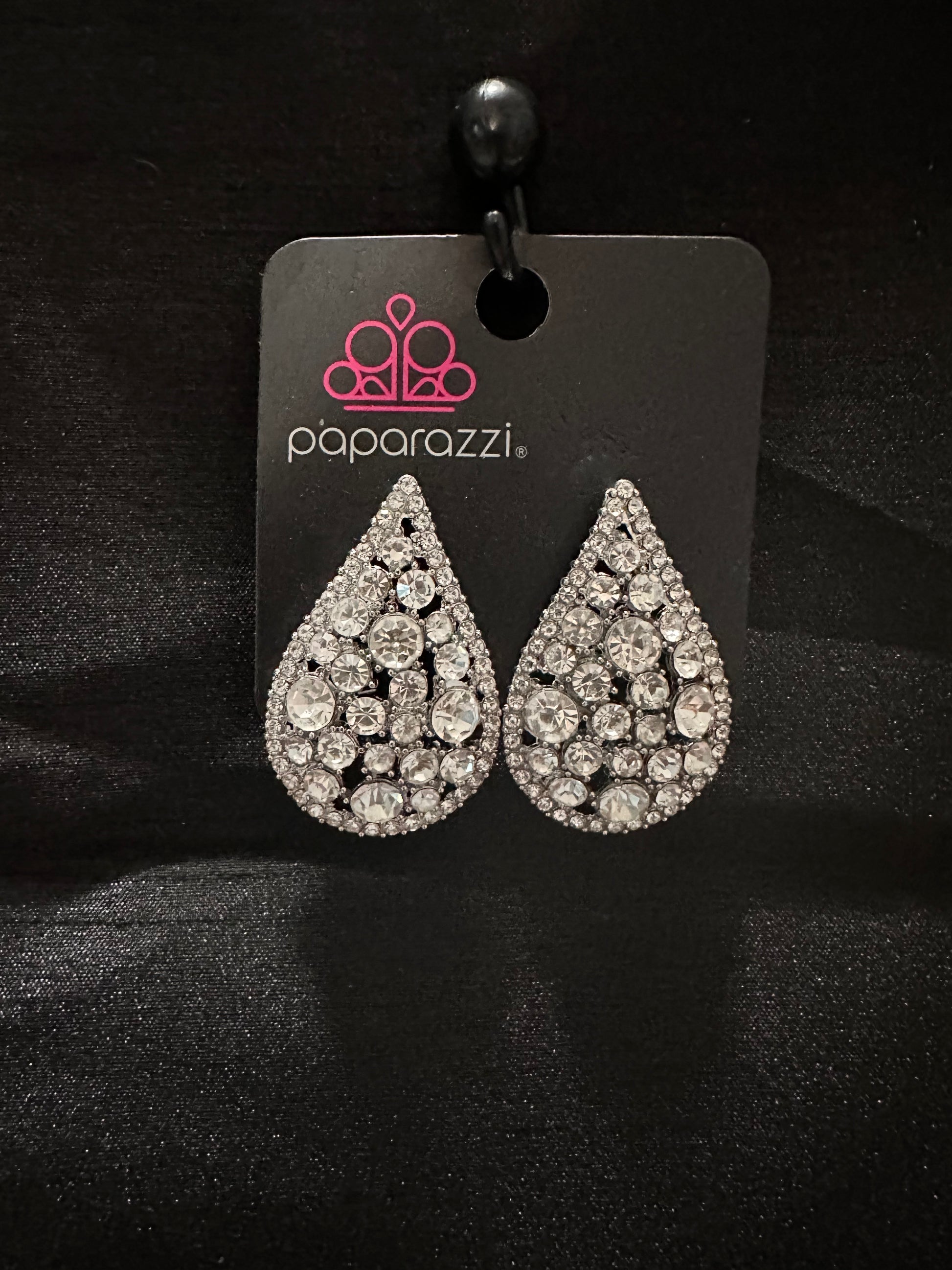 Radiating with glassy white rhinestones, oversized silver teardrops adornthe ear for a dramatic flair. Earring attaches to a standard post fitting.