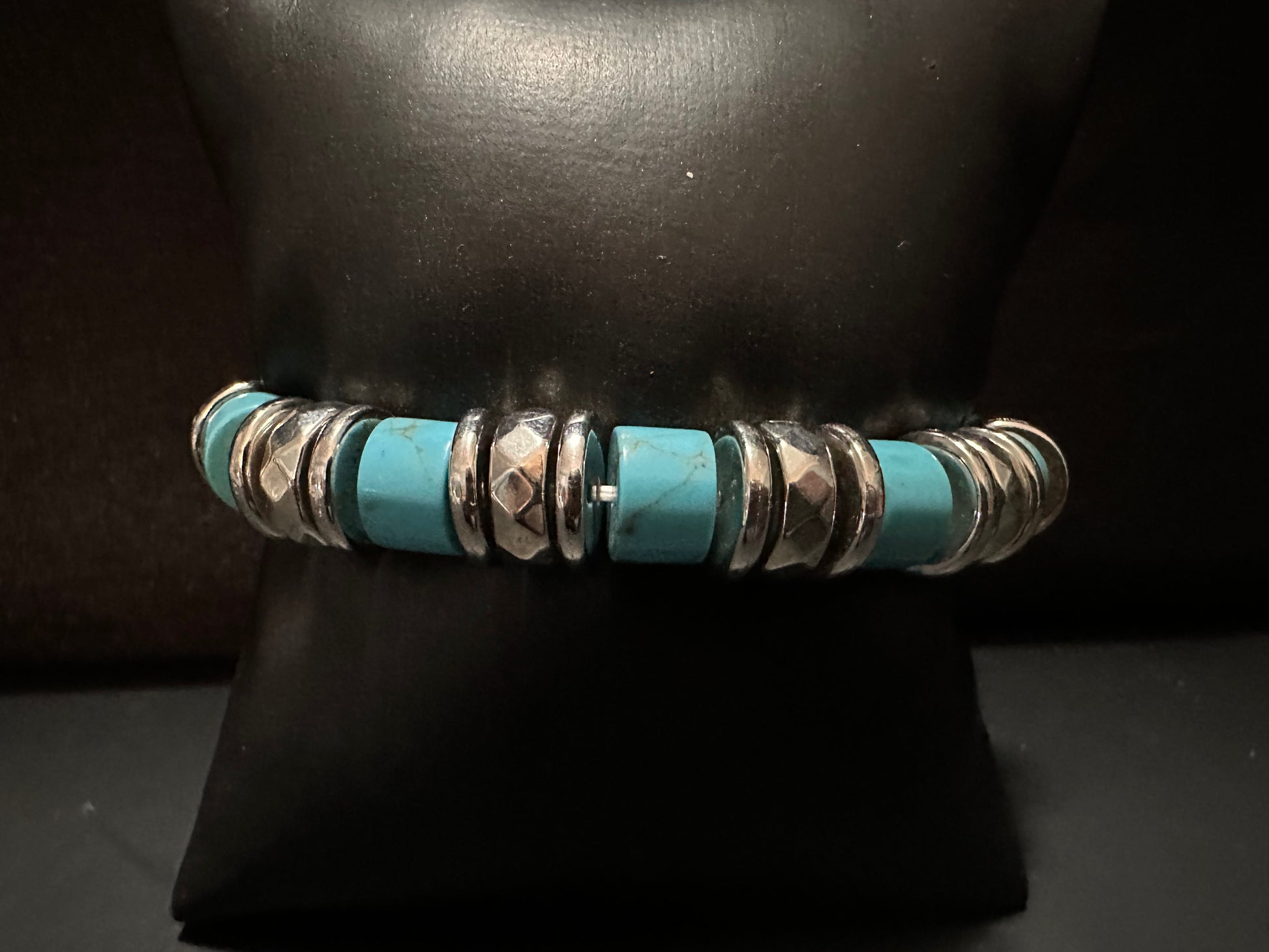 An array of refreshing turquoise stone beads, hammered silver rings, and shiny silver discs are threaded along a stretchy band around the wrist for a seasonal flair.