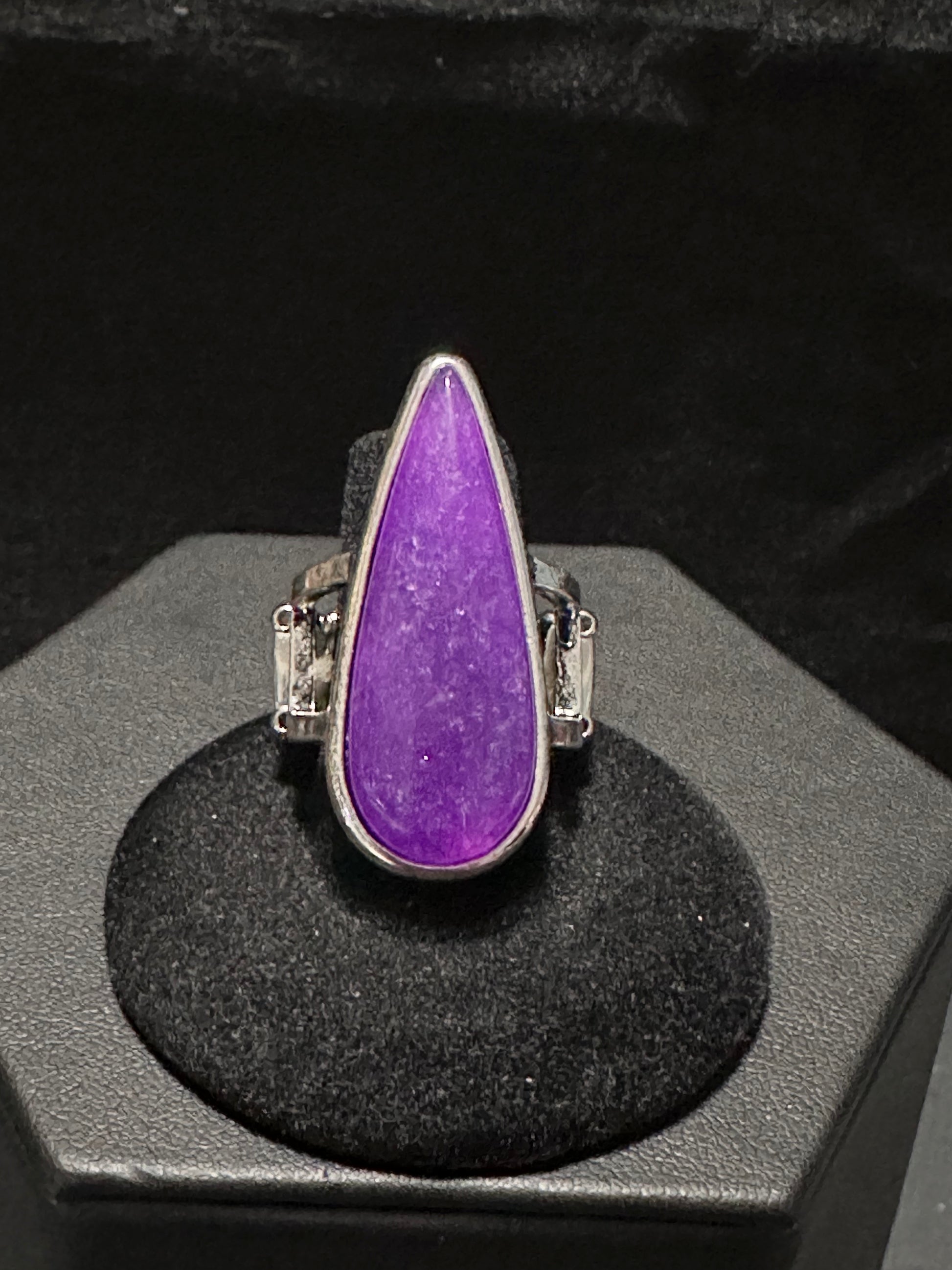 An elongated purple stone teardrop is pressed into a sleek silver frame atop the finger, creating a mystical centerpiece. Features a dainty stretchy band for a flexible fit.